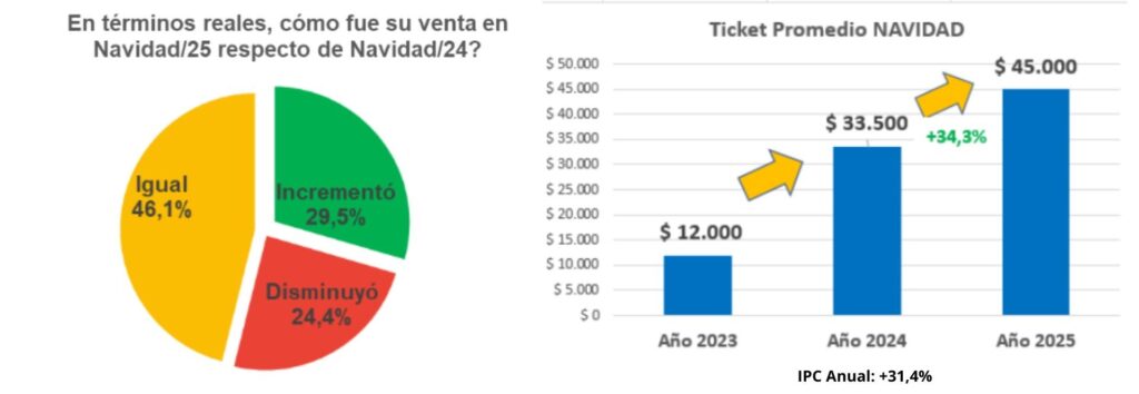 Uno de los datos más relevantes del informe fue el aumento del ticket promedio. En la Navidad 2025, el gasto promedio por compra alcanzó los 45.000 pesos, lo que representa una suba del 34,3% respecto de 2024, cuando el ticket fue de 33.500 pesos.